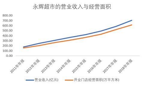 虽然公司未在三季报中解释营业收入增长的原因,但《每日经济新闻》记者在梳理了永辉超市历年年报后发现,永辉超市的营业收入与其门店的经营面积具有高度相关性。伴随着永辉超市开业门店的经营面积稳步增长,其营业收入也实现了稳步增长。